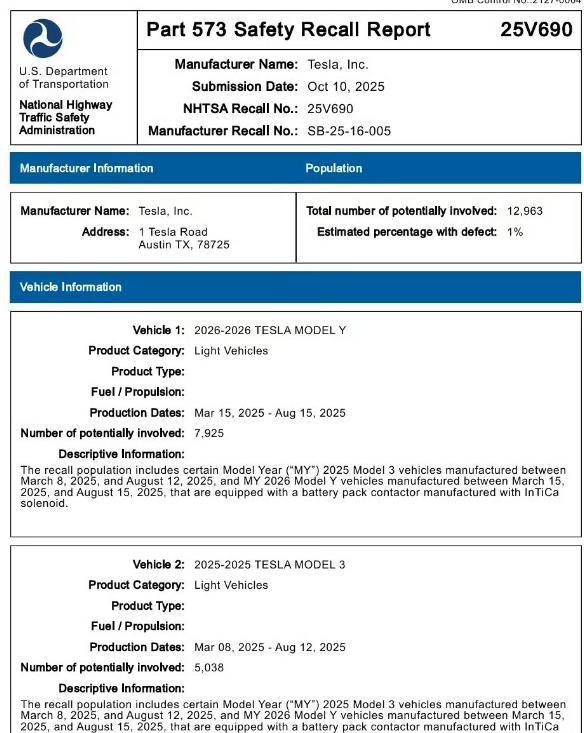 近日,据新闻媒体报道,因电池组连接部件存在缺陷,在行驶过程中或造成车辆动力突然丧失的情况,从而增加碰撞风险。特斯拉在美宣布召回近13000辆的电动车。其中,涉及召回的车辆生产日期为今年3月-8月生产的Model Y 车型7825辆及5038辆的Model 3车型。召回的问题大多为车型搭载的电池包接触器使用了存在制造缺陷的InTiCa电磁线圈。这样会造成线圈终端连接不良,或存在突然断开的情况,导致车辆瞬间丧失动力。